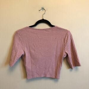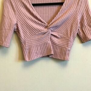 Details: crop top with 3/4 sleeve, keyhole detail in center, deep v neckline