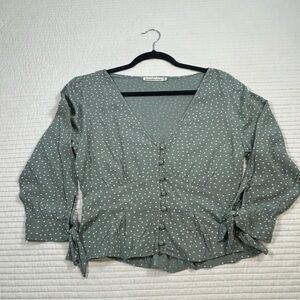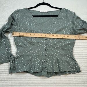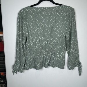 This elegant blouse features a sage green hue with a delicate white polka dot pattern, offering a chic and sophisticated look. The 3/4 sleeves with tie detail add a touch of modern style, while the fitted silhouette ensures a flattering fit. Perfect for both casual and formal occasions, this top is a versatile addition to any wardrobe. EUC. Pet and smoke free.