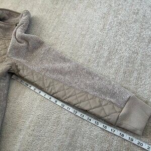 A light tan / taupe pullover fleece half asymmetric snap top with pocket and quilted faux leather panel design