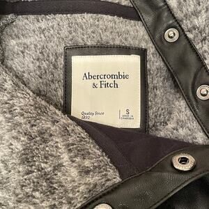 Elevate your outerwear game with this Abercrombie & Fitch oversized sherpa pullover in heathered gray with quilted faux leather accents. This piece features a high snap-button funnel neck, front zip pockets, ribbed cuffs, and a curved hemline for a flattering fit.