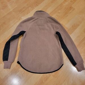 This is so adorable and cozy while on trend. I dont know if youd consider this more fleece or more sherpa. Seems like a fabric that is somewhere inbetween the two. I love the neutral colors. Asymmetrical buttons at the neckline. Functional front pockets. Quilted details. Slight discoloration at wrist shown in last photo. Hardly noticeable. have not tried to wash out so may wash out.