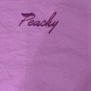 Front detail: Embroidered "Peachy" script at left chest