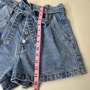 Blue Wash High Waisted Mom Shorts. Exposed Button Fly. Belted. Tie Waist. Paperbag Waist