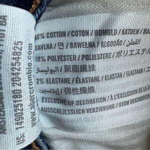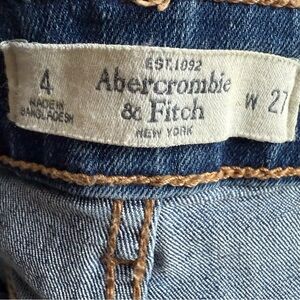 The product is a pair of Abercrombie & Fitch shorts in size 4, equivalent to a 27 waist. These blue denim jean shorts feature a solid pattern, zip closure, and raw fabric wash with distressed and frayed hems. The mid-rise shorts have a regular fit and are made of a blend of polyester, cotton, and elastane. Ideal for a festival, American, or classic themed look, these shorts are great for walking, school, or beach activities.