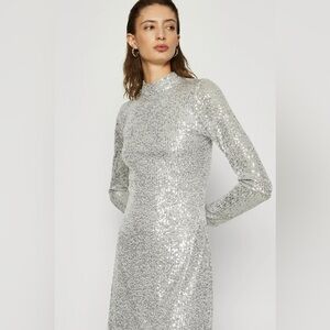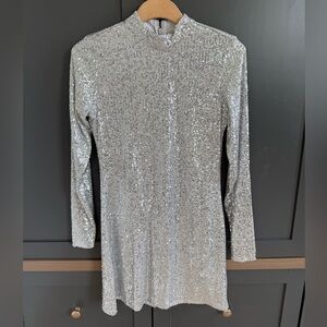 Dazzle in this stunning silver sequin dress. Perfect for evening events. Features long sleeves and a sleek silhouette.