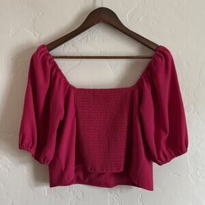 Abercrombie & Fitch Size Large Puff Sleeve Corset Sweetheart Top - Pink Smocked. Features all over dark pink color, sweetheart neckline, short puff sleeves, cropped length, corset style waist, smocked back, and pullover closure. 100% polyester.