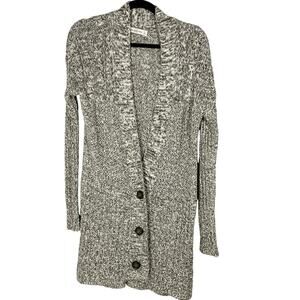 Keywords: Abercrombie, oversized cardigan, marled knit, open knit sweater, breathable, boho cardigan, chunky knit, gray white sweater, slouchy cardigan, comfy knit, lightweight knit, long cardigan, relaxed fit, cotton blend, 3-button, minimalist layers, transitional weather, casual chic