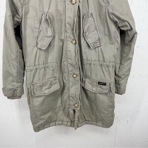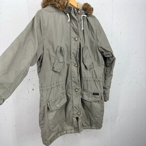Abercrombie & Fitch Size XL Olive Drab Faux Fur Trim Hood Utility Parka Jacket Coat. There is some wear to the hood fur( detachable hood) and normal wear to body & lining.