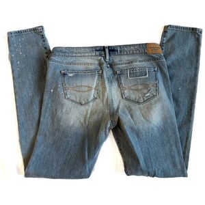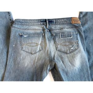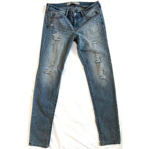 Worn-in and effortless, these Abercrombie & Fitch skinny jeans feature a medium blue wash with heavy distressing, patchwork detailing, and subtle splatter marks for a vintage-inspired vibe. Branded hardware throughout, including Abercrombie logo rivets, button, and signature leather patch at the waistband. Mid-rise fit with a tapered skinny leg. Soft and broken-in feel. Great condition with intentional distressing; no additional flaws.