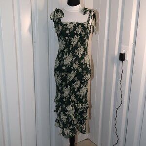 Abercrombie & Fitch Smocked Midi Dress Tie Straps Ruffle Green Floral Size S NWT