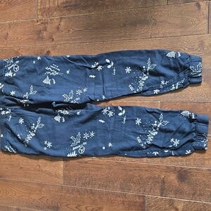 Soft Flannel Jogger Sleep Pajama Pants with elastic waist and Drawstring. Printed design with holly, snowflakes, NEW YORK, skyline, LOVE. Great pre-owned condition.