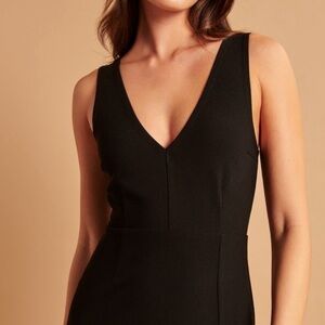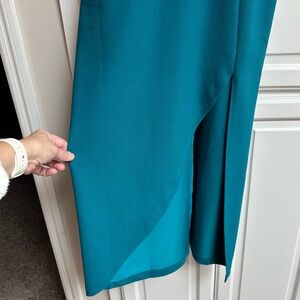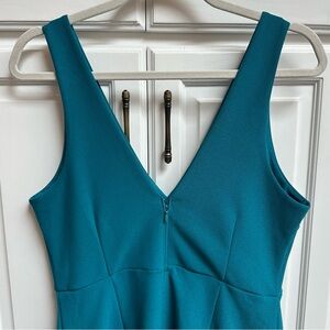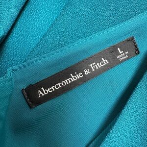 Abercrombie & Fitch wedding guest dress. Stretch crepe midi dress. V-neck, with slit. Teal blue. Size large. In excellent preowned condition. Model pics for fit, not color.