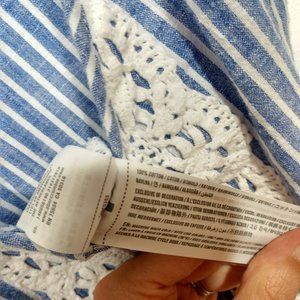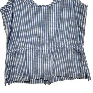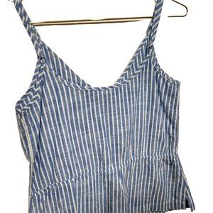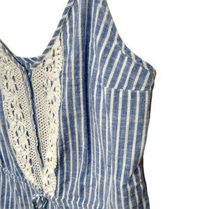 This camisole tank top from Abercrombie & Fitch in blue and white lived in vintage linen look fabric, style number -140F035, has striped pattern, lace / crochet accent, cropped length, adjustable straps and drawstring.