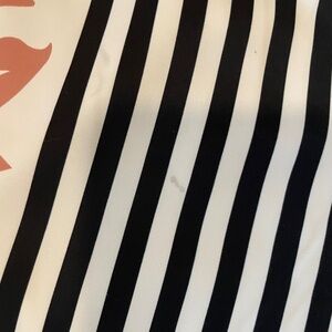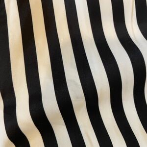 Chic wide-leg pants with black and white stripes. Features red accents and floral details. Perfect for stylish outings.
