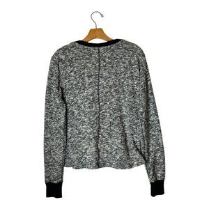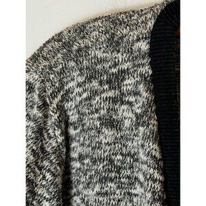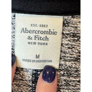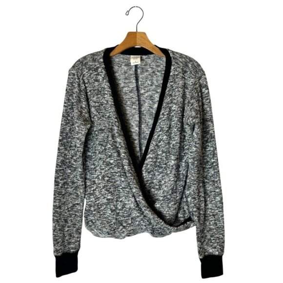 This Abercrombie & Fitch women's medium black metallic thread sweater features a stylish wrap front design. A versatile addition to your wardrobe, its heathered knit fabric makes it perfect for any casual occasion.