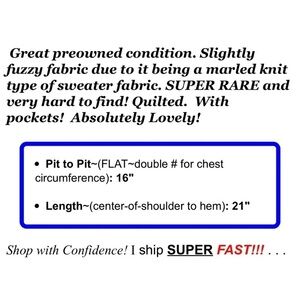 Great preowned condition. Slightly fuzzy fabric due to it being a marled knit type of sweater fabric. SUPER RARE and very hard to find! Quilted. With pockets! Absolutely Lovely!