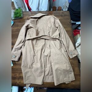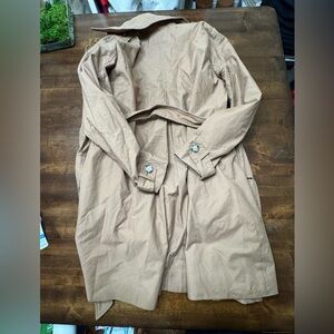 Classic tan trench coat with a sleek double-breasted front. Includes a matching belt for a refined silhouette.