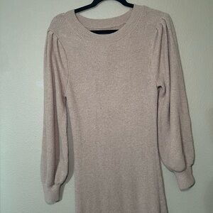 Elegant tan maxi dress. Features long sleeves and ribbed texture. Perfect for any occasion.