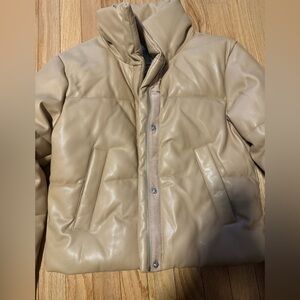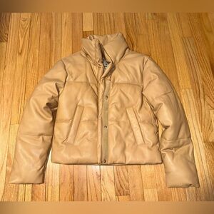 In great condition, Stylish tan puffer jacket. Features a high collar and snap buttons.