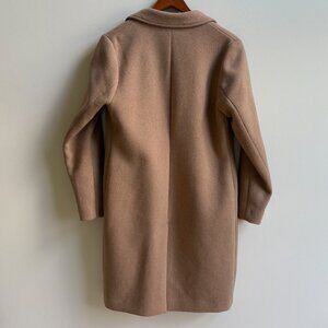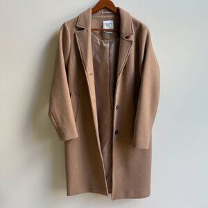 Stylish tan trench coat. Classic design. Perfect for layering.