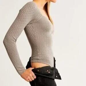 This bodysuit by Abercrombie & Fitch is a pull on style with snap closures underneath, has a square neckline and pointelle style knit (open weave, zig zag pattern). Fabric is a soft viscose blend in a taupe brown color. Minimal wear, bodysuit is in excellent condition! No flaws to note.