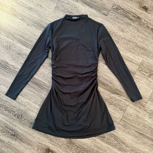 Slim-fitting long-sleeve mini dress in our softAF cotton-modal fabric, featuring mini mock neckline, flattering side ruching details and a thigh-high slit detail. Imported.