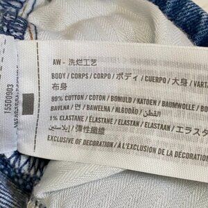 5 pocket high rise/ distressed back notched hem/distressed knees and thigh/zip fly