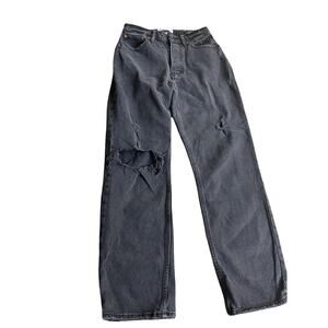 The Abercrombie & Fitch The Dad High Rise Jeans in size 2 Short (26) with a button fly and straight leg fit are a stylish choice for women looking for a relaxed yet flattering look. Made from dark wash denim with a logo accent, these black jeans feature a high rise waist and a solid pattern. The 90s-inspired design and classic cotton fabric make them a versatile addition to any wardrobe, suitable for casual and trendy outfits alike.