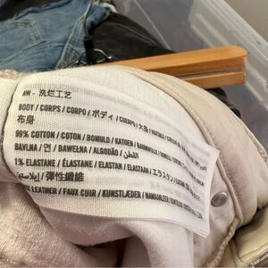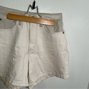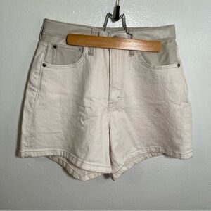 Good condition. Abercrombie & Fitch. The Dad Short. High Rise. White and Cream Vegan Leather details. Our on-trend high rise Dad shorts, that gives a relaxed fit throughout the thigh, featuring a cream wash, on-trend vegan leather mixed fabric detail, functional pockets, belt loops and clean hem. Curve love. Size 27/4. Stretch 99% cotton, 1% spandex. Waist 12.5” Inseam 5” Front Rise 12”. All measurements are approximate and taken lying flat. Smoke free home. No trades, offers welcome.