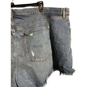 High-rise distressed denim shorts in light blue, featuring frayed hems and fashionable distressed details. Made from stretch cotton blend for comfort. Size: 24W.