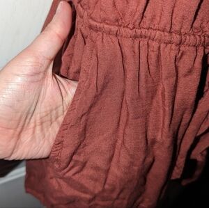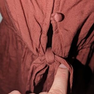 This romper is in gently used condition. It is a lightweight material. Features a button front that goes to waist. The waist is elastic. Has a key hole, with a tie at the stomach. Straps are fully adjustable. It also has pockets. Please see photos for details.