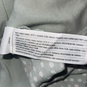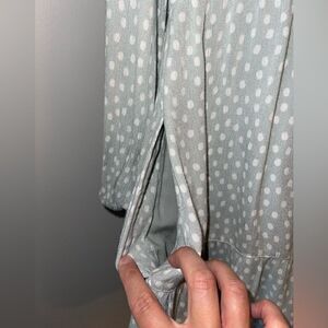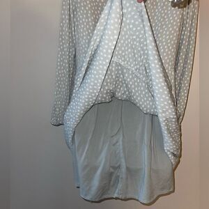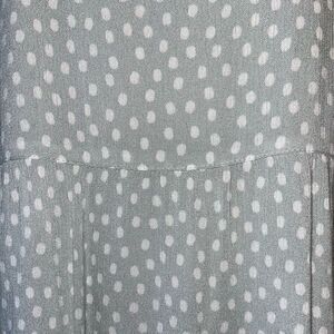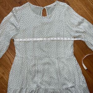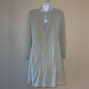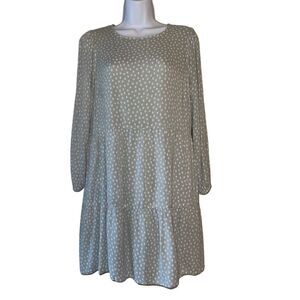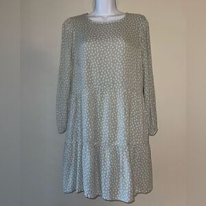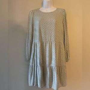 long-sleeve babydoll Style minidress. Mint green with ivory dots.