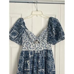This blue and white maxi dress features a mix of floral and tile-inspired prints reminiscent of classic Delftware and Portuguese azulejos. Designed with a sweetheart neckline, tie-front keyhole detail, and puffy flutter sleeves, it has a fitted bodice that flows into a long, tiered skirt for graceful movement. Crafted from lightweight, breezy fabric, it’s ideal for warm-weather getaways or indoor occasions.