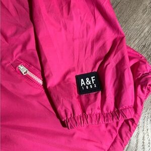 Vibrant pink windbreaker with a front zipper. Features A&F logo patch on the sleeve.