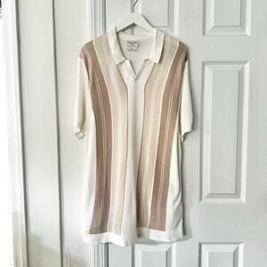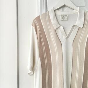 Size XXL from Abercrombie & Fitch. White tan and beige stripe. Button up collared retro polo knit shirt. Preowned in good condition with no stains or tears.