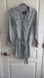 White dress with blue stripes. Tie waist, cargo type button sleeves (can be unbuttoned and rolled down), chest pockets, full button down front, regular pockets. Shirt dress style. Fully lined.