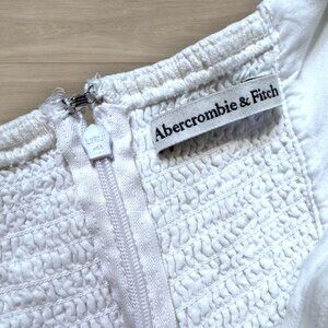 Effortless and feminine Abercrombie & Fitch mini dress in crisp white linen blend. Features ruffle shoulder straps, a fitted bodice with smocked back for comfort, hidden side zipper, and soft viscose lining. Perfect lightweight sundress for summer, vacation, beach, or casual wear. A timeless piece that can be dressed up or down.