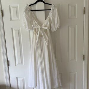 Elegant white midi dress. Features puff sleeves and a deep V-neckline. Perfect for any occasion.
