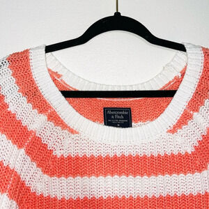 Abercrombie & Fitch white & peach striped knitted sweater. In excellent condition! Wide crew neckline. Long sleeves. Straight bottom hemline. Thick open stitch knitting. White & bright peach stripes. Size medium.