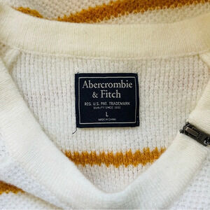 Abercrombie & Fitch white & mustard yellow striped knit sweater. In excellent condition! Crew neckline. Long sleeves. Zipper detail on left shoulder. Tight knit plush material. Off white with mustard yellow stripes. Size large.