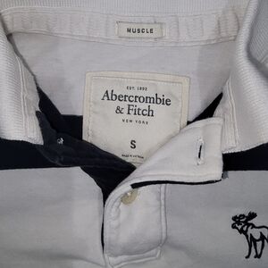 This Abercrombie & Fitch polo shirt showcases a classic nautical style with its bold white and navy blue stripes. The short sleeves and soft cotton-like texture make it perfect for casual and sporty occasions. Its navy blue collar adds a touch of sophistication to this timeless piece.