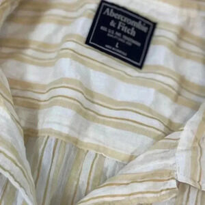 Elevate your wardrobe with this classic Abercrombie & Fitch button-up shirt in a sunny yellow and white stripe pattern. Crafted from a lightweight linen blend, this top features long, fitted sleeves, a collared neckline, and button closure. Perfect for any occasion, whether you're traveling, working, or just enjoying a casual day out with old money vibes.