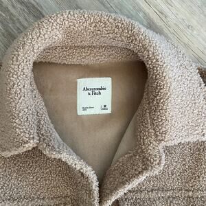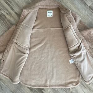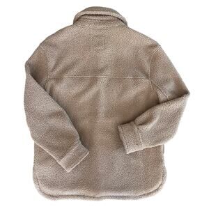 Abercrombie & Fitch women shirt jacket in size Medium. Designed in a light brown (tan), this versatile “shacket” (shirt-jacket hybrid) features soft sherpa fleece exterior, button-up front, and dual chest flap pockets. Fully lined inside for added warmth and comfort, it’s perfect for layering as a casual jacket or wearing as a thick overshirt.