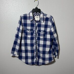 Slightly used excellent condition. Smoke free home. Abercrombie & Fitch plaid button shirt blue size small. No issues. Pockets on the front.