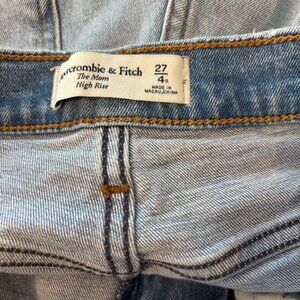 Abercrombie & Fitch Women's 27 Light Wash Distressed The Mom High Rise Jeans. Waist measures approx 14 inches across laid flat, inseam is approx 26 inches, and rise is approx 10.5 inches.