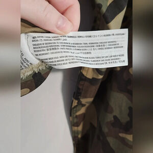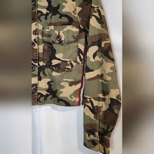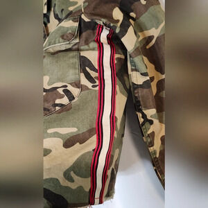 100% cotton, collared, button front, long sleeve, red navy tan ribbon on sides, raw hem, 2 front pockets, utility, camouflage