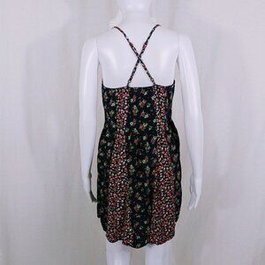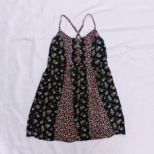 Spaghetti strap, floral, sundress. Adjustable, criss cross straps. Five button closure in the front.