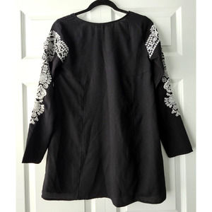 Lightweight, flowy, black with white embroidery dress. Features long sleeves with the embroidery continuing down them. V-neck neckline. Tunic style. Boho bohemian style.