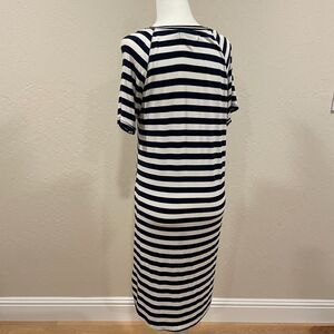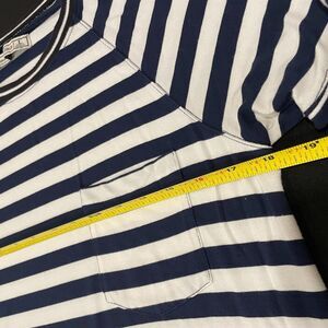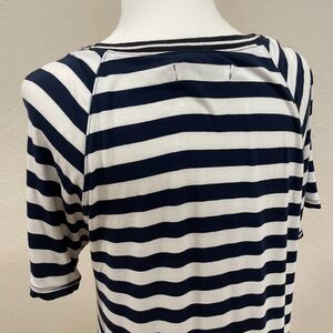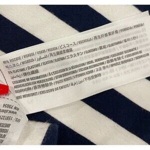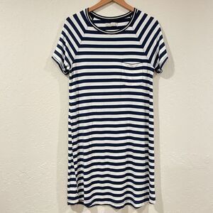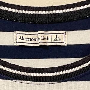 This Abercrombie & Fitch women's size Large L Lg very stretchy sleep shirt / night gown / night shirt is perfect for anyone who wants to stay comfortable while they sleep. The navy blue and white striped comfy lightweight fabric is made from a blend of elastaine and viscose, making it perfect for nighttime comfort. Round neckline and short sleeves. Machine washable; easy care.