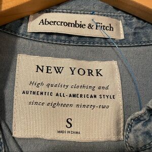 Abercrombie & Fitch Women’s Small Blue Chambray Shirt Pockets Tie Neck. Good Preowned with normal signs of use, no rip, tear, or foul odor. Please see pictures as they are a very important part of the description. Solid preowned condition.